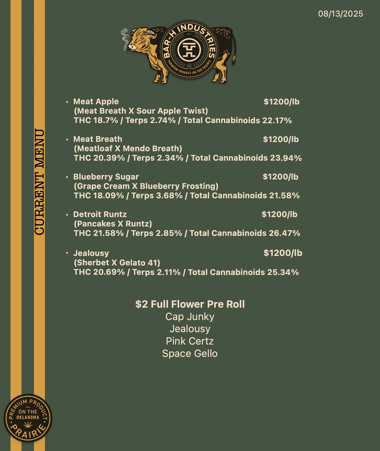 Our Premium Full Flower Pre-Rolls are $2.50 per pre-roll. This is the best pre-roll you will find in Oklahoma, period. It's living soil, it's all-natural, it's smooth - it's truly the premium pre-roll on the prairie. Don't believe us? Contact us and try some. Your customers will thank you.